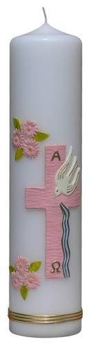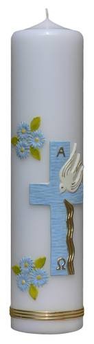 Świeca wykonywana w kolorach białym i ecru. Zdobiona aplikacją woskową.