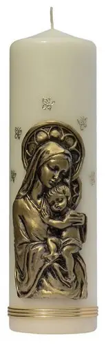 Świeca wykonywana w kolorach białym i ecru. Zdobiona aplikacją woskową.